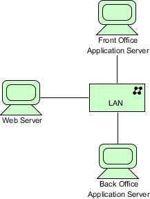 下面的 ArchiMate 图表显示了多个服务器的示例,这些服务器建模为设备,通过局域网 (LAN) 互连。
