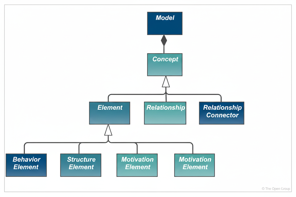 | Top-Level Hierarchy | Model = Elements + Relationships Elements = Structure / Behavior / Motivation / Composite |