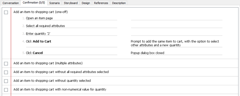 - Let’s describe the result expected by adding an item into shopping cart. You can press the Tab key to move on to the Expected Result field, or click on the field directly. Then, enter Prompt to add the same item to cart, with the option to select other attributes and a new quantity.