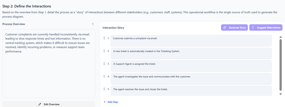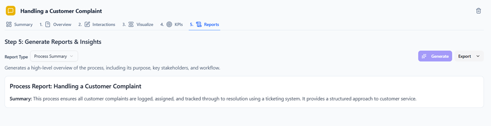 - Process Discovery → AI parses descriptions to identify steps, stakeholders, and issues.