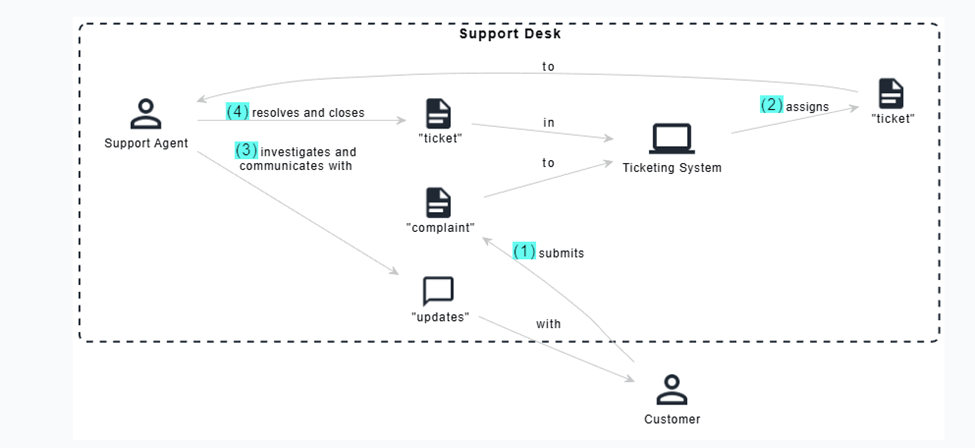 Visualization: AI generates diagrams showing stakeholders and flows, for Customer, Support Agent, Ticketing System, and Support Manager. Arrows show flows like “submits complaint” → “creates ticket” → “assigns to agent.”
