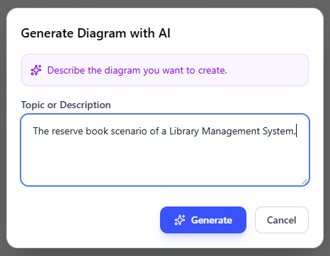 Generate-from-Text Engine: Converts plain text prompts (e.g., “Create a sequence diagram for a user logging into a website”) into structured UML sequence diagrams with actors, actions, and temporal flows.