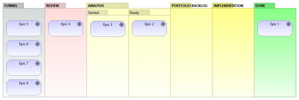 看板可用于工作和工作流的可视化。看板显示了例如开发需求、史诗、用户故事等如何从待办事项流向就绪状态(完成)。看板可根据开发案例的规模和范围应用于多种用途。例如,在 EA 级别使用“史诗”或在项目级别使用“用户故事”或“需求”作为工作项。工作项的粒度可能因情况而异。