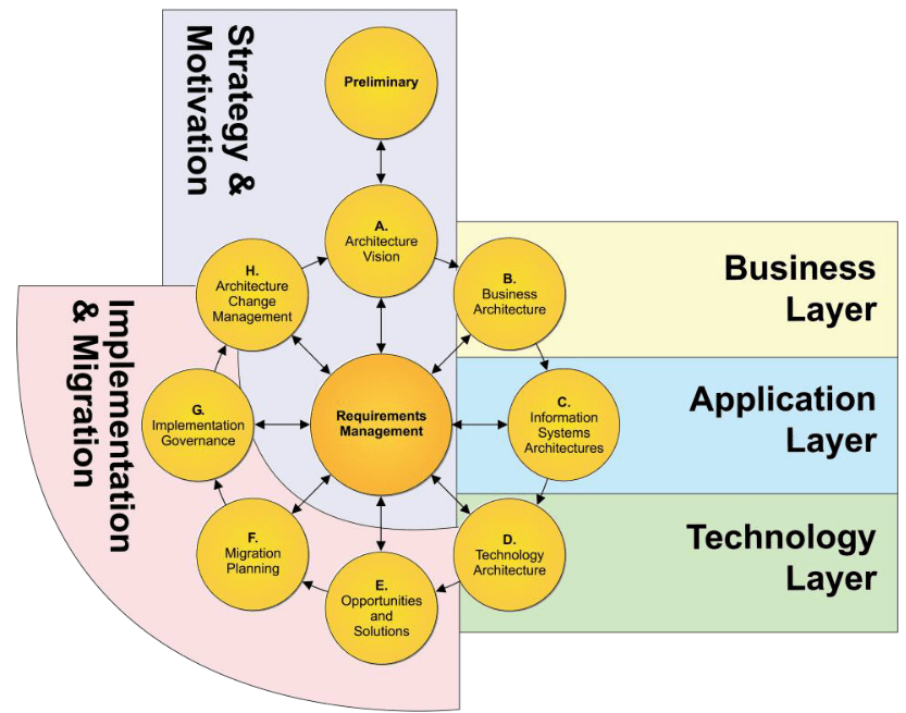 业务、应用和技术层支持 TOGAF 框架定义的业务、信息系统和技术架构域的描述,以及它们之间的相互关系。