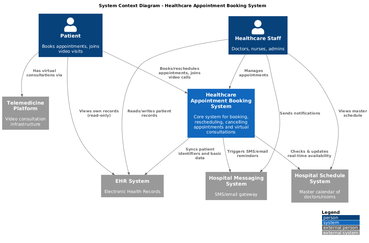 System(booking_system, “Healthcare Appointment Booking System”, “Core system for booking, rescheduling, cancelling appointments and virtual consultations”)