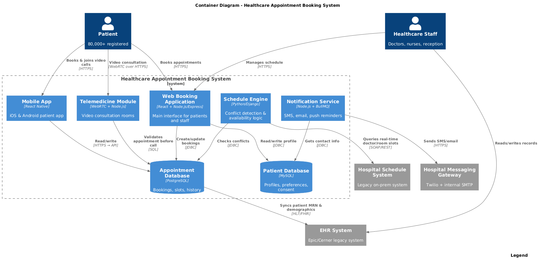 “Create a complete C4 model (Context + Container diagrams) for a modern Healthcare Appointment Booking System. Actors: Patients and Healthcare Staff (doctors, nurses, admins). The system lets patients book, reschedule, and cancel appointments 24/7, join telemedicine video calls, receive automated reminders, and view their own medical summary. It integrates with an existing EHR system, a hospital master schedule system, and a messaging gateway. Use modern tech stack: React web app, React Native mobile app, Node.js backend, Python scheduling engine, PostgreSQL + MySQL databases, WebRTC for video.”