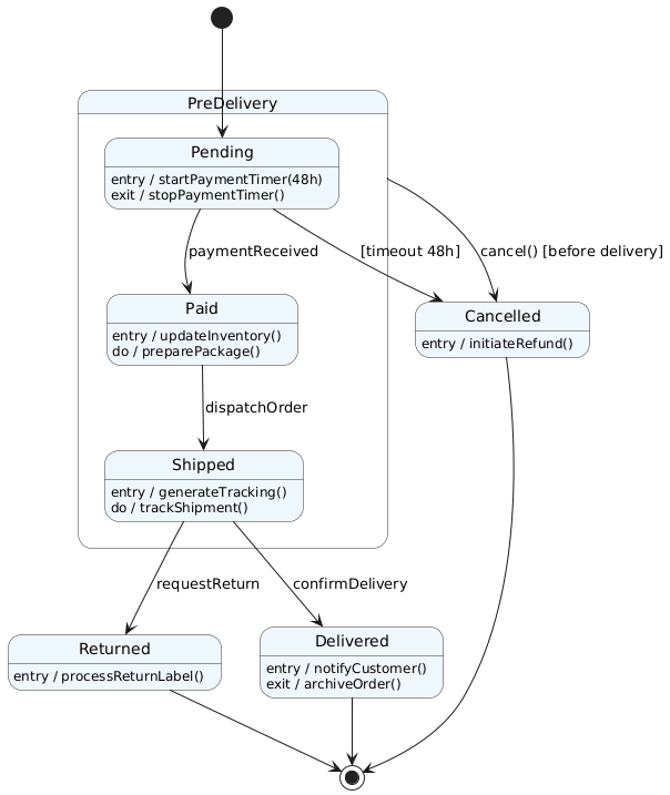 “Create a UML state machine diagram for an e-commerce order with the following states: Pending (with 48-hour payment timeout leading to cancellation), Paid, Shipped, Delivered, Cancelled, and Returned. Include a composite state for pre-delivery phases. Add entry, do, and exit actions: startPaymentTimer(48h) on Pending entry, updateInventory() on Paid entry, generateTracking() on Shipped entry, notifyCustomer() on Delivered entry, initiateRefund() on Cancelled entry, processReturnLabel() on Returned entry. Add global cancellation transition from PreDelivery to Cancelled. Define transition from Pending to Cancelled on timeout. Make Delivered, Cancelled, and Returned final states.”