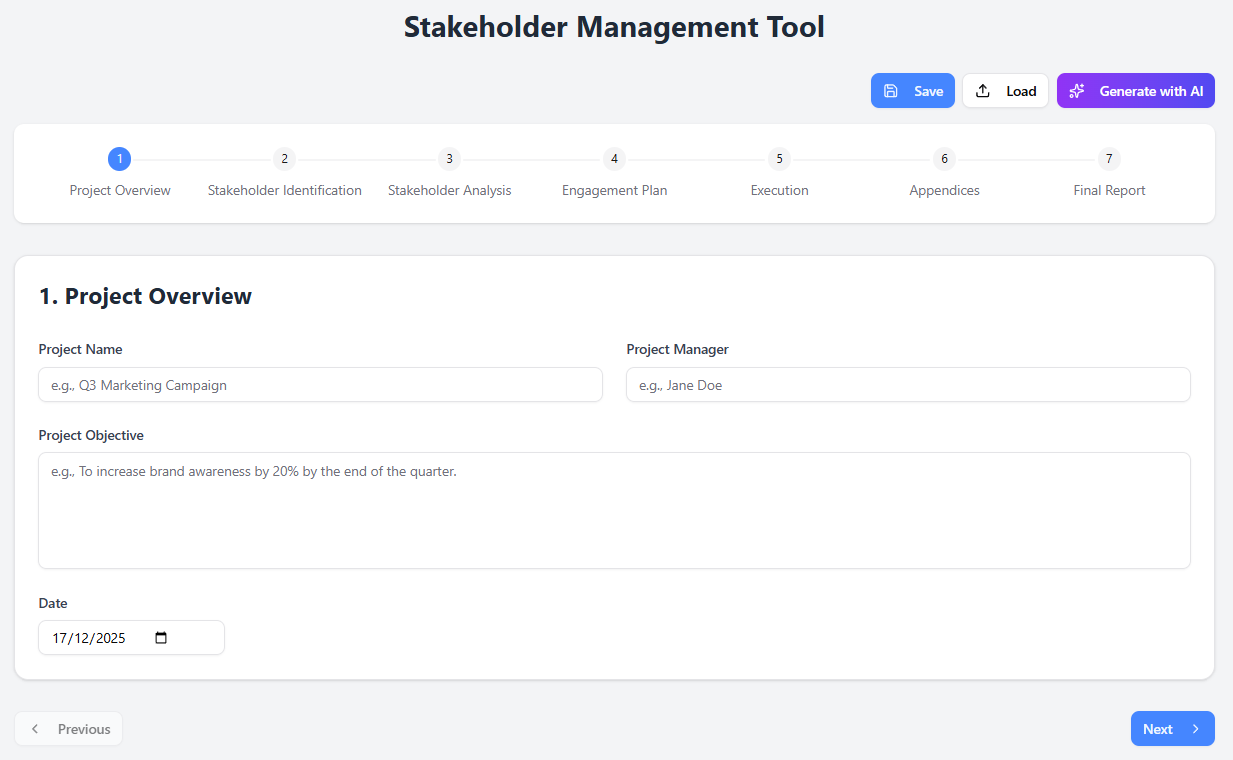 The AI Stakeholder Management Tool is a free, guided solution designed to simplify and streamline the stakeholder management process. It provides a 7-step wizard to ensure a rigorous, systematic approach.