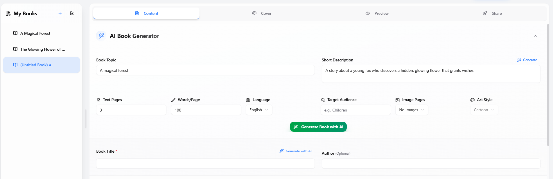 - AI-Generated Cover: Enter a prompt (e.g., “A futuristic spaceship with vibrant colors”) and let the AI create a cover for you.
