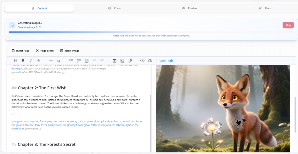 - Click “Generate Images” to let the AI create illustrations that match your narrative.