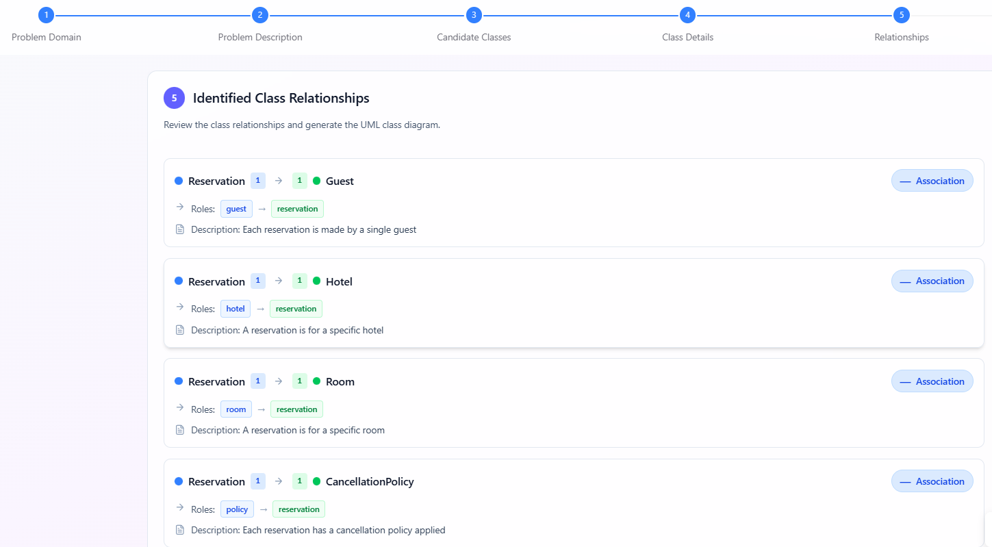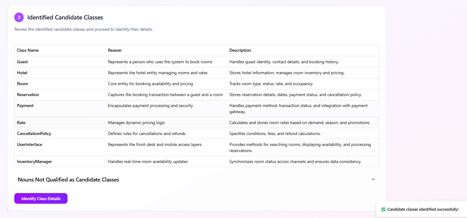 - Reduces manual effort: Automatically identifies classes, attributes, and relationships from text.