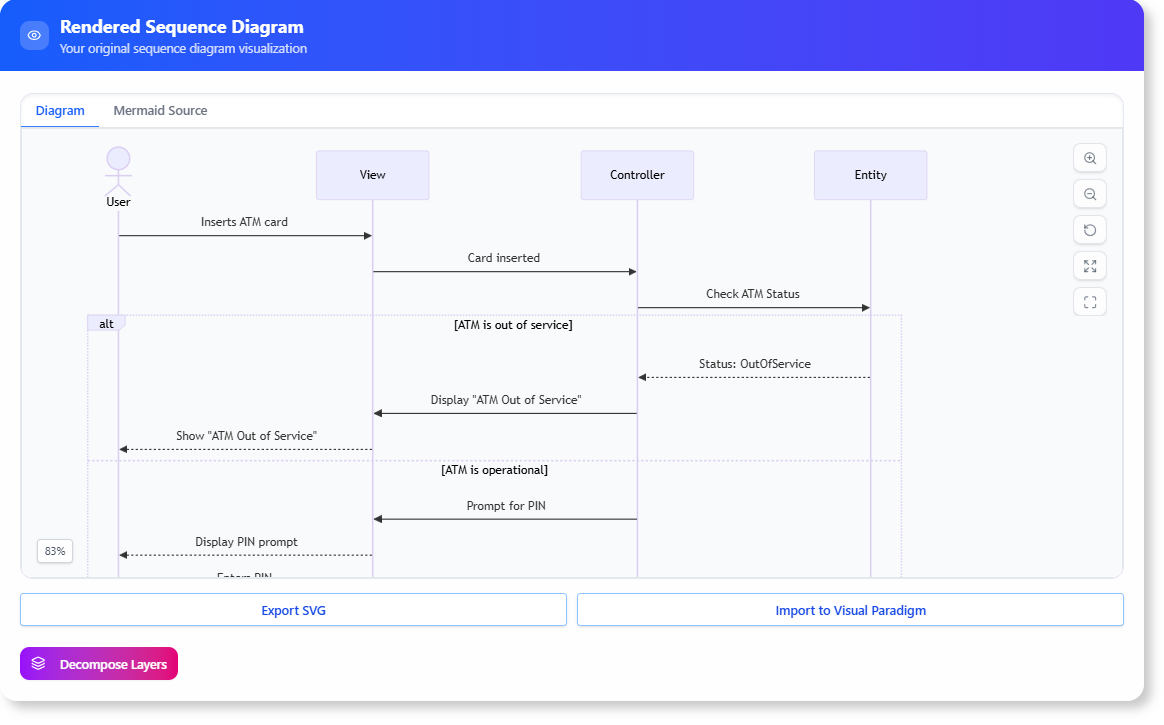 - In sequence diagrams, participants include users, systems, databases, APIs, or other components. The tool identifies these automatically based on the description.