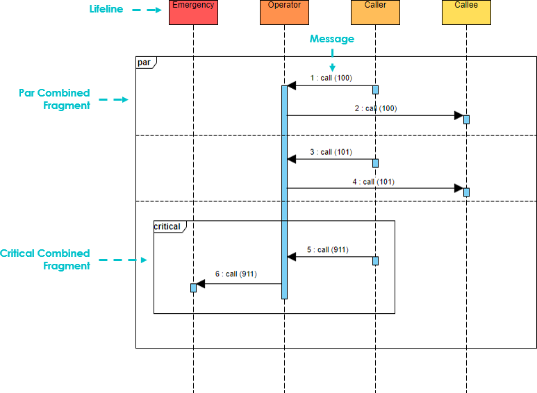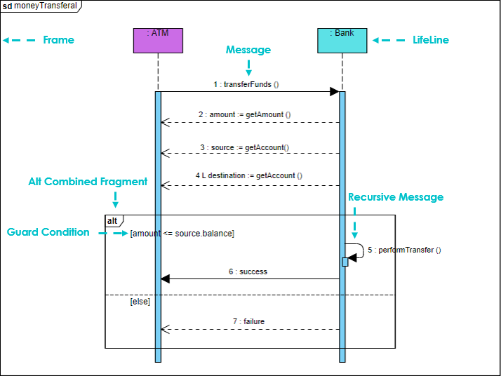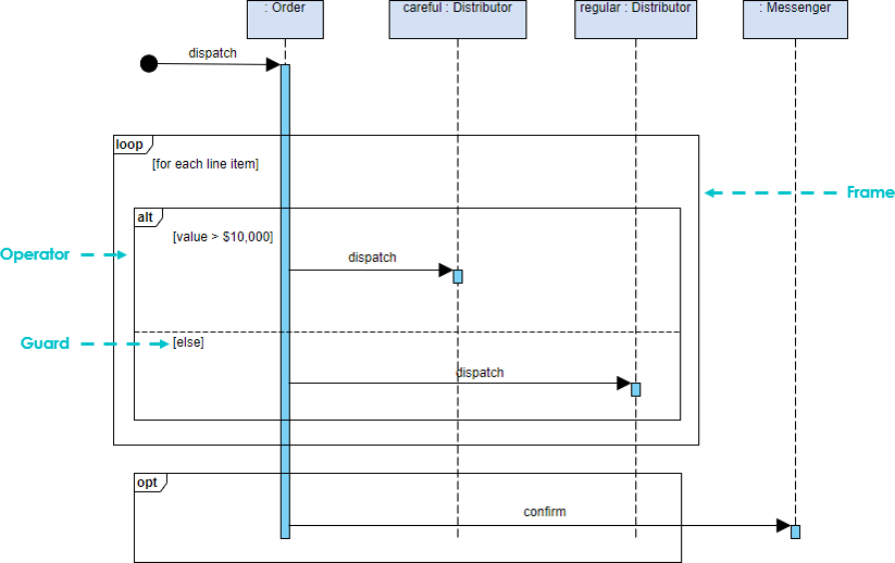 The fragments in the sequence diagram are rectangular frames drawn over a portion of the diagram. They represent the conditional structure that affects the flow of messages. These frames are called combined fragments in the UML specification, and the containers are called interaction operands. Frames are labeled in the upper left corner. This label is referred to as the interaction operator in UML.
