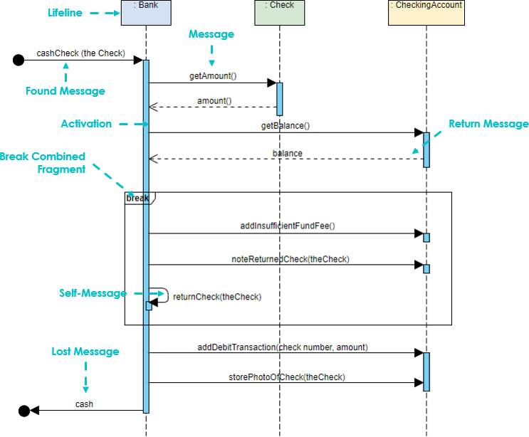 Breaks are most commonly used to model exception handling. This sequence diagram example uses a break combination fragment because it treats the balance < amount condition as an exception instead of as an alternative flow. To read this example, we start at the top left corner of the sequence and read down. When the sequence gets to the return value “balance,” it checks to see if the balance is less than the amount. If the balance is not less than the amount, the next message sent is the addDebitTransaction message, and the sequence continues as normal.