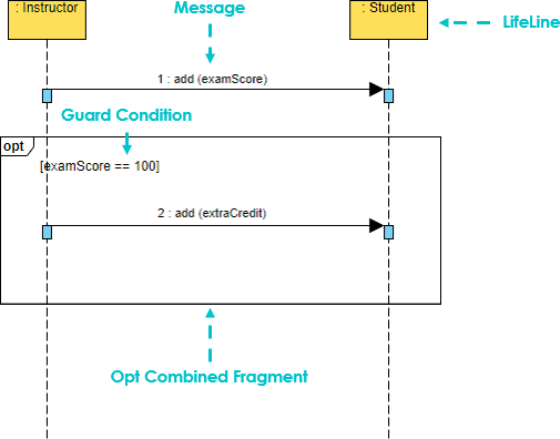 | opt | Optional: the fragment executes only if the supplied condition is true. Equivalent to an alt only with one trace. |
