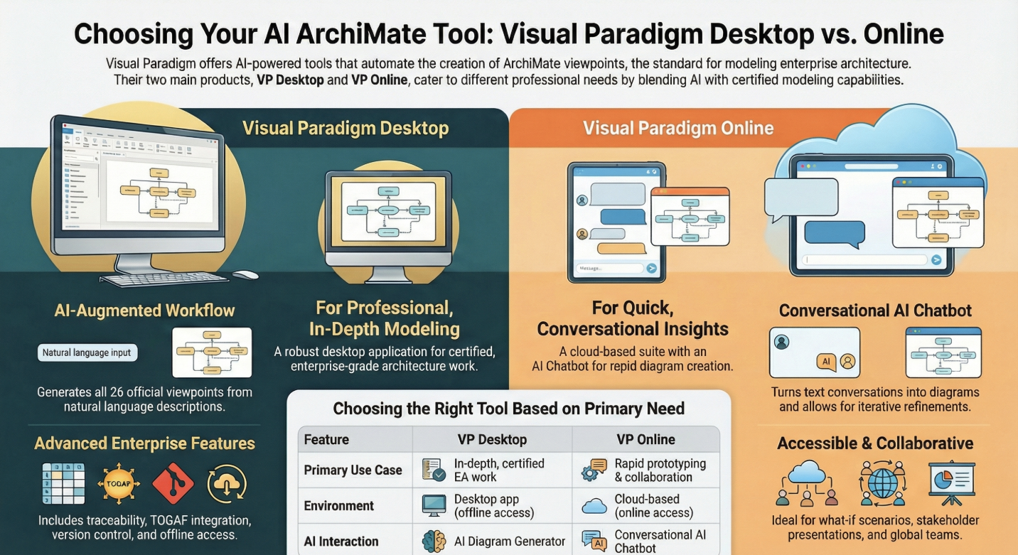 In 2026, Visual Paradigm delivers unmatched value: rapid generation, precise standards support, seamless editing, and continuous updates (including late-2025 enhancements to ArchiMate AI tools). Available in Online (cloud collaboration) and Desktop editions—with free trials to test generative features instantly.