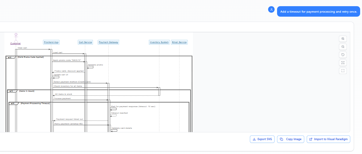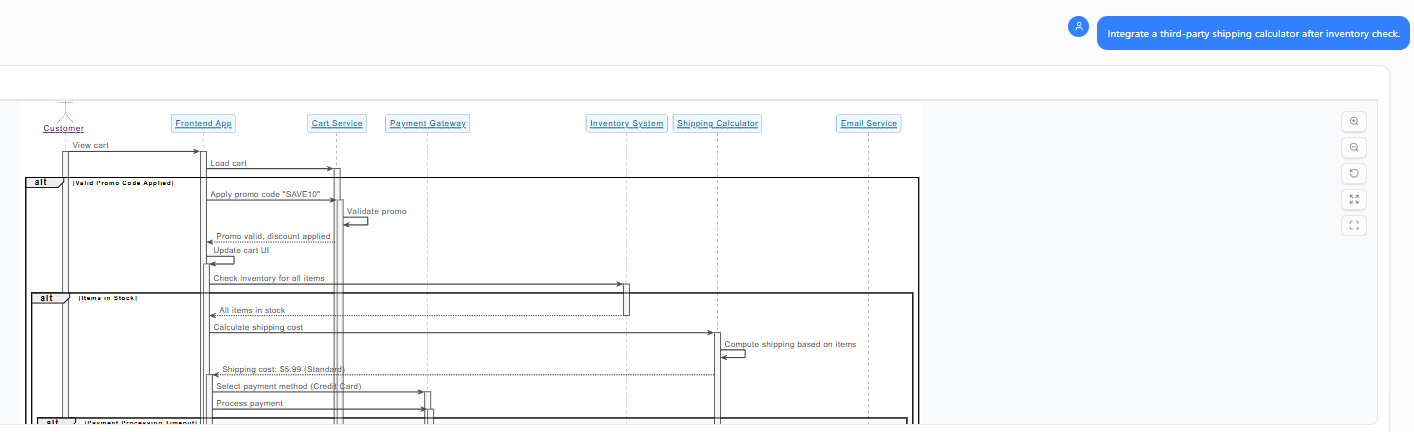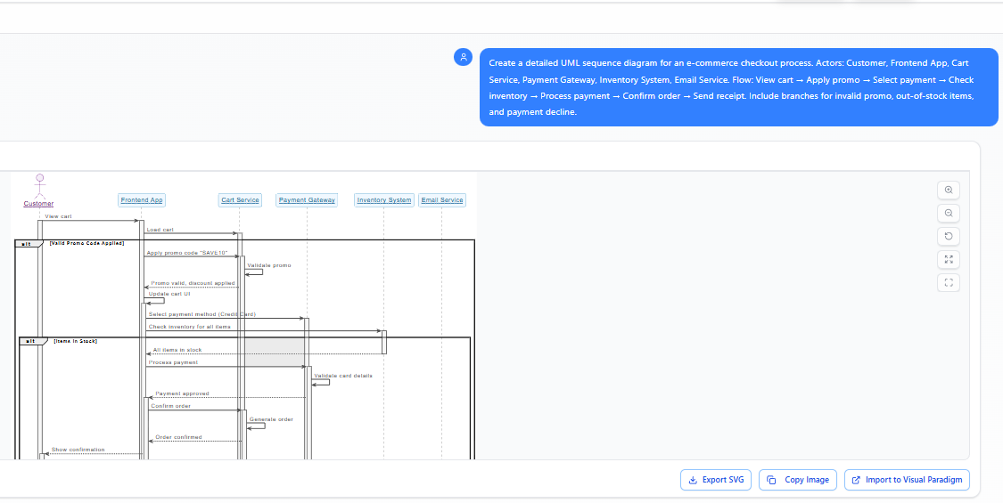 To showcase the AI Chatbot’s true power, let’s apply it to a real-world case study: Designing the sequence diagram for an e-commerce platform’s checkout process. This scenario involves multiple actors (Customer, Cart Service, Payment Gateway, Inventory System), complex branching (e.g., promo codes, out-of-stock items, payment failures), and security checks—perfect for highlighting how the AI handles intricacy without manual diagramming.