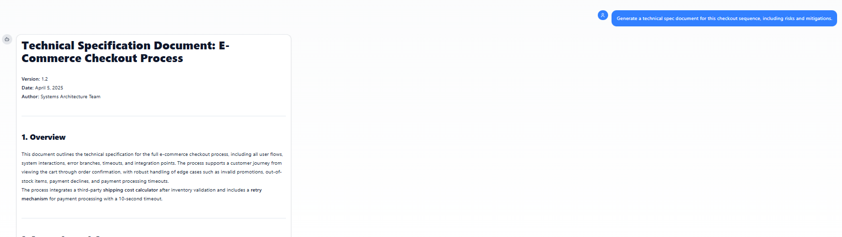 - Content Generation: “Generate a technical spec document for this checkout sequence, including risks and mitigations.” Output: A 800-word Markdown doc with diagram embed, step-by-step narrative, UML notes, and a risk table (e.g., “Payment Failure: 5% rate → Mitigate with alternative methods”).