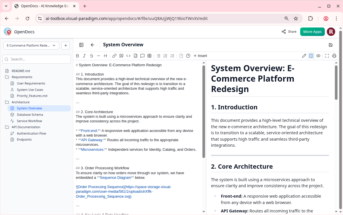 Enter OpenDocs, Visual Paradigm’s new AI-native knowledge management platform. After exploring its capabilities, it’s clear this isn’t just another wiki clone. OpenDocs reimagines how teams create, connect, and leverage collective intelligence by embedding artificial intelligence directly into the documentation workflow. Whether you’re scaling a startup, managing enterprise projects, or building personal knowledge systems, OpenDocs promises to turn scattered information into a dynamic, searchable, and genuinely useful “single source of truth.”