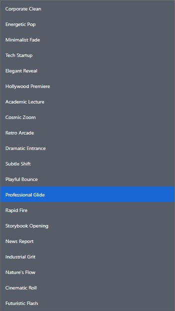 Choose from an incredible library of 20 pre-configured animation profiles that instantly transform your entire deck with a single click. Each preset applies a perfectly coordinated style across all slides.