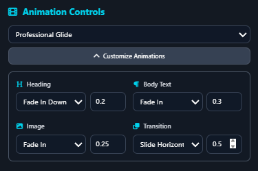 You can adjust durations, delays, directions, and effects per element — globally or per slide. Build suspense, emphasize key points, or create cinematic storytelling flow.